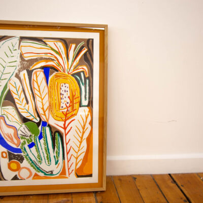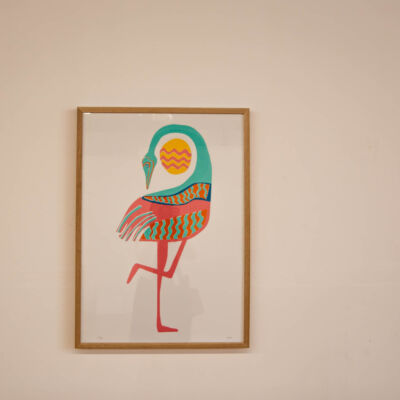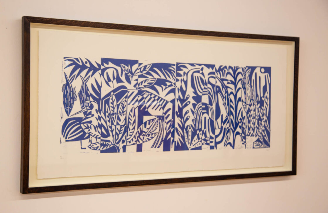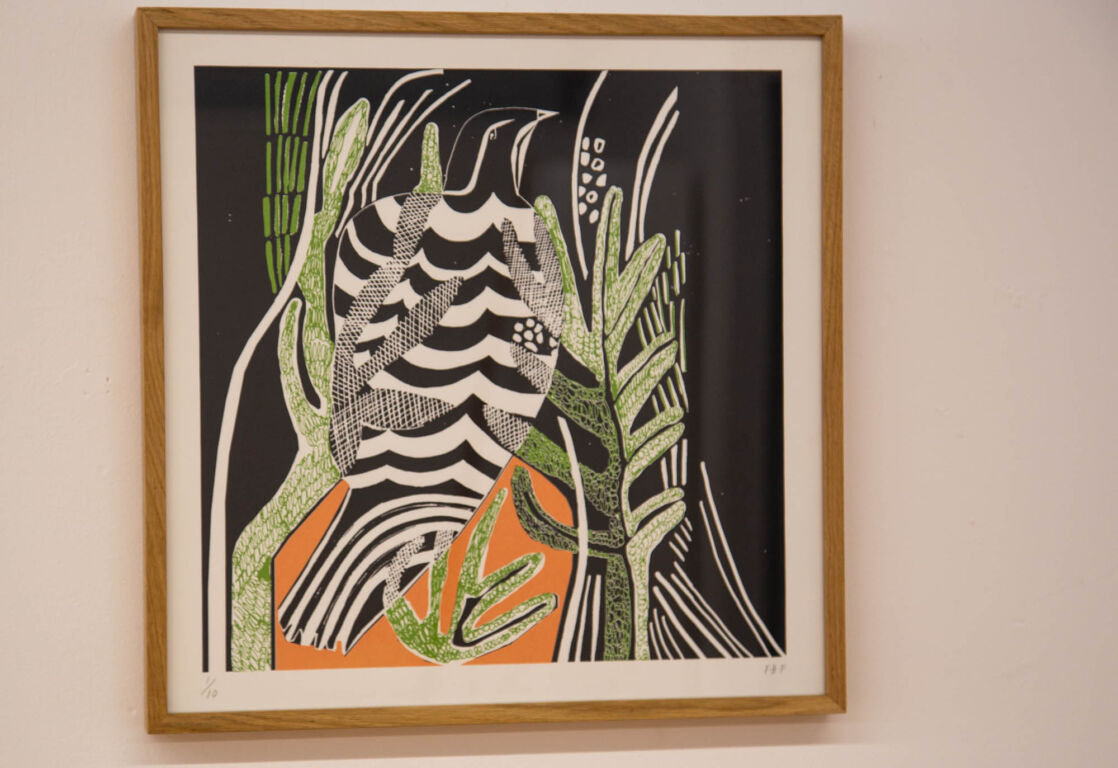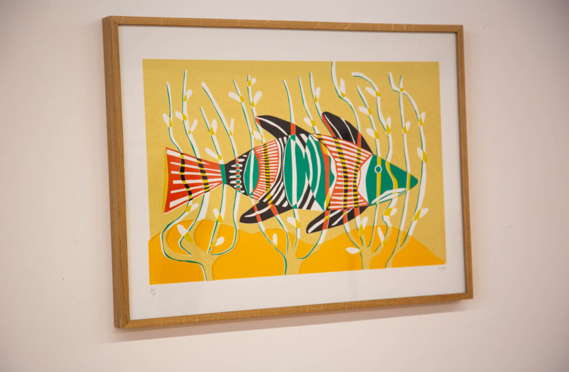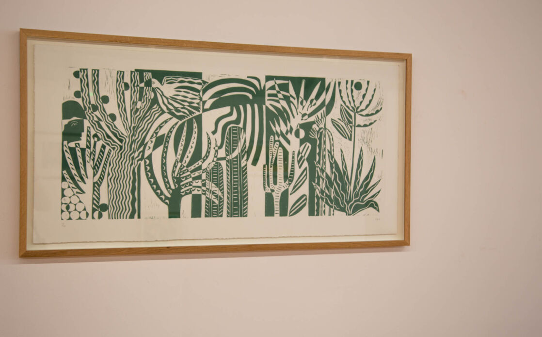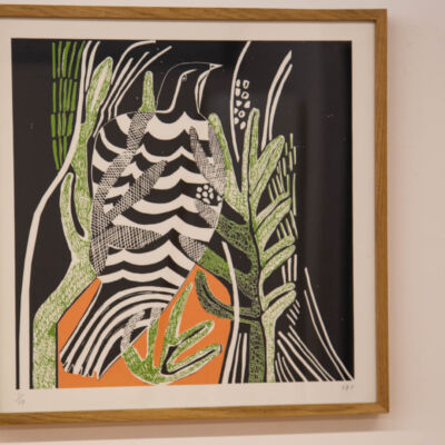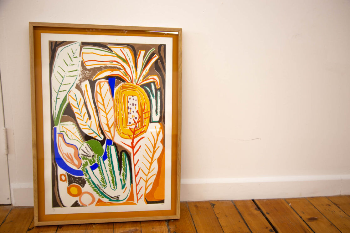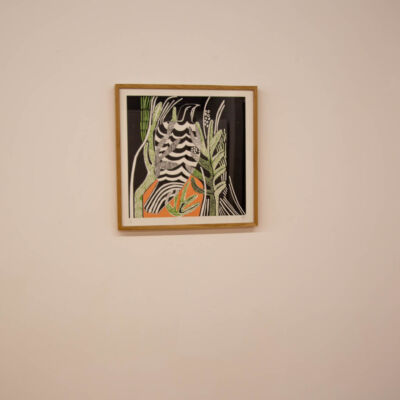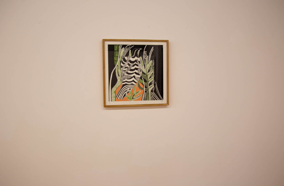 One of her favourite pieces in the exhibition is Huatulco, inspired by her 2024 artist residency in Mexico. During her time there, she learned to screen print using natural pigments traditionally found in local textiles. The experience had a lasting impact, deepening her exploration of positive and negative space, balance, and visual storytelling through composition. The vivid colours and distinctive forms of Mexico’s flowers and plants resonate throughout the exhibition.