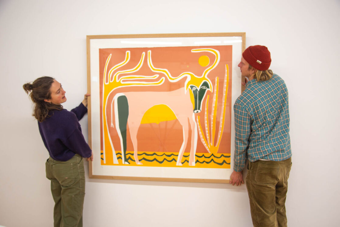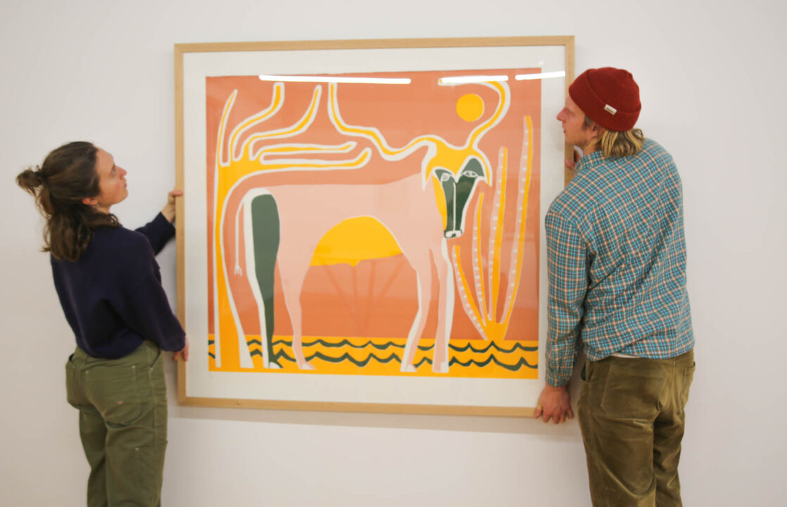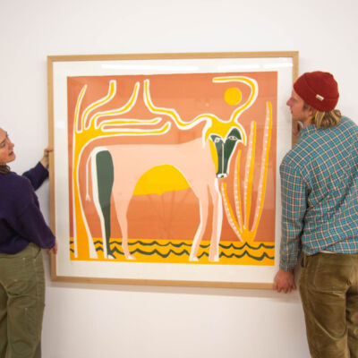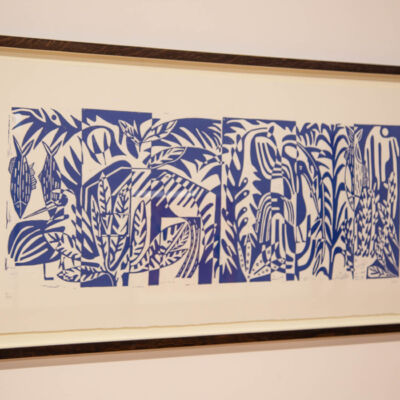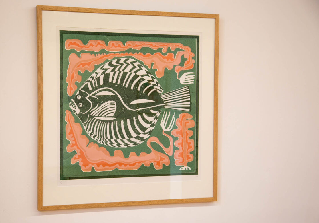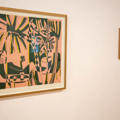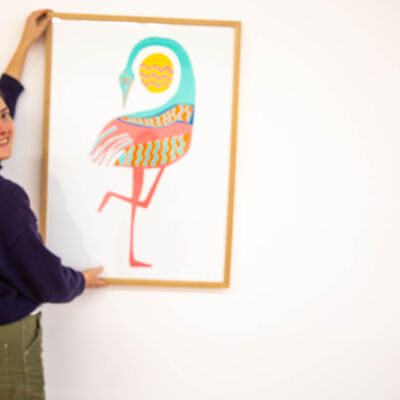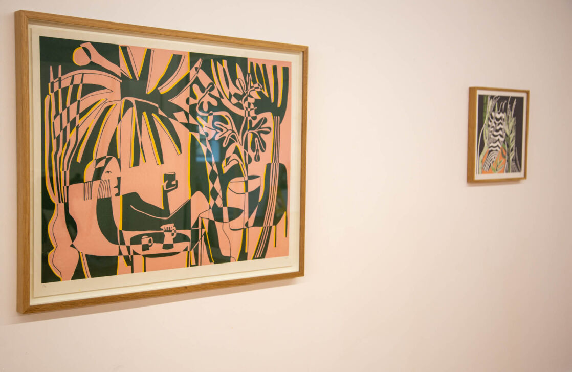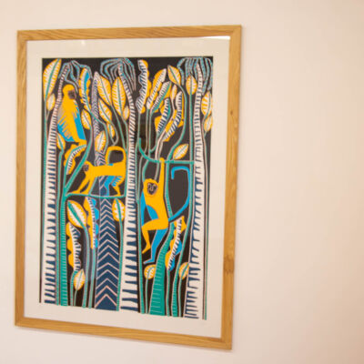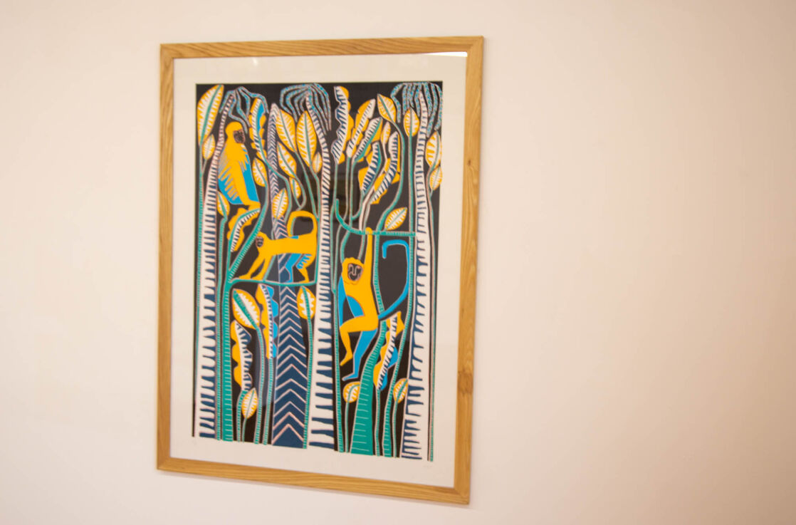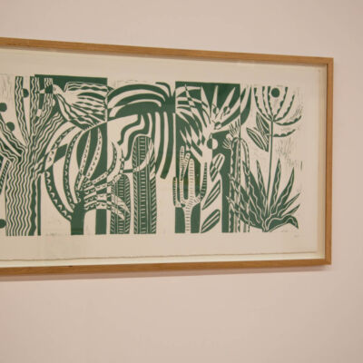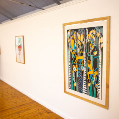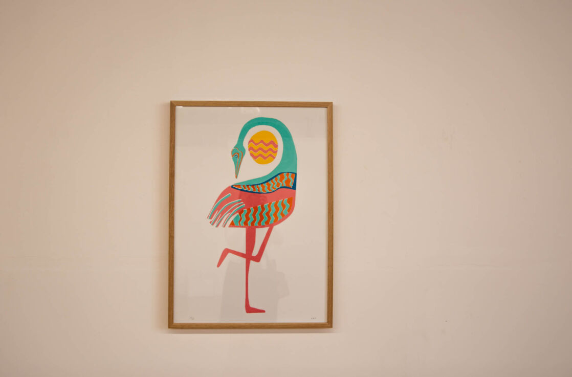 One of her favourite pieces in the exhibition is Huatulco, inspired by her 2024 artist residency in Mexico. During her time there, she learned to screen print using natural pigments traditionally found in local textiles. The experience had a lasting impact, deepening her exploration of positive and negative space, balance, and visual storytelling through composition. The vivid colours and distinctive forms of Mexico’s flowers and plants resonate throughout the exhibition.