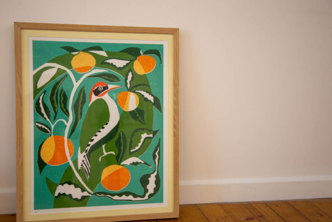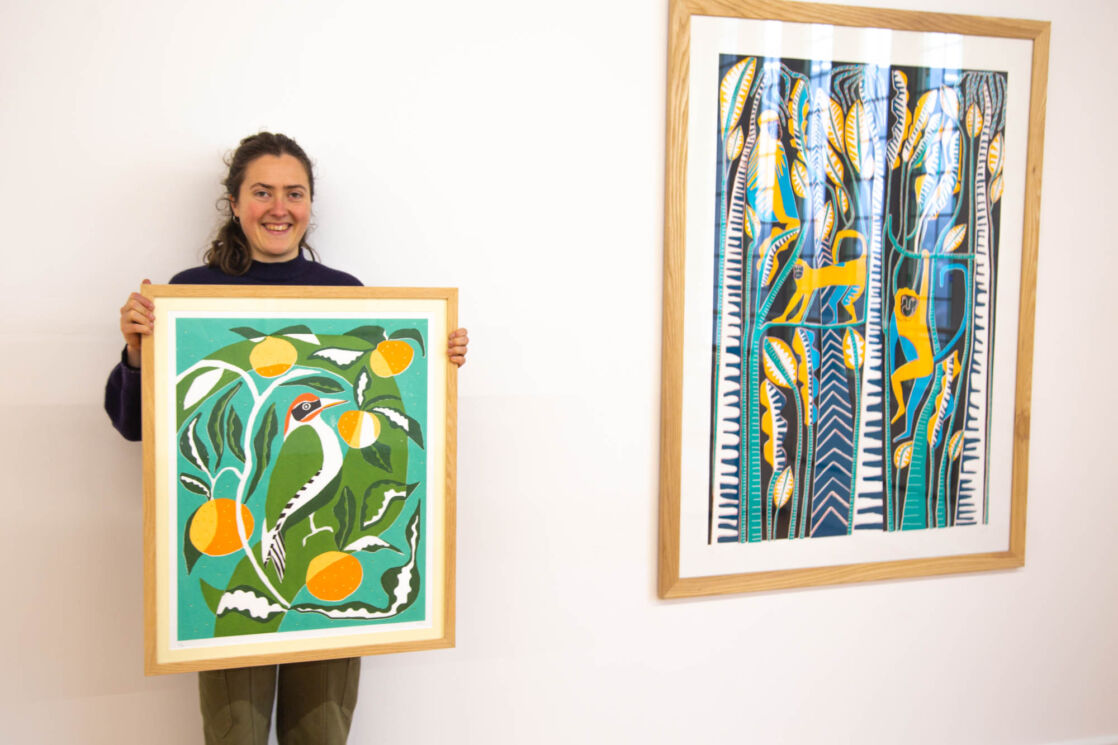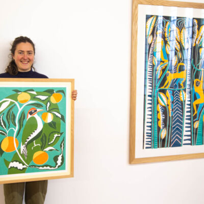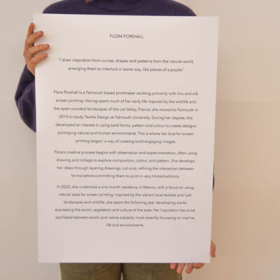 Since graduating, Flora has focused on developing her studio practice, producing limited-edition screen prints and lino prints on paper. Inspired by the natural world — its curves, forms and organic rhythms — she carefully composes shapes so they interlock like pieces of a puzzle. Collage plays a key role in her process, allowing her to experiment freely with marks and forms before separating colours and translating her ideas into print.