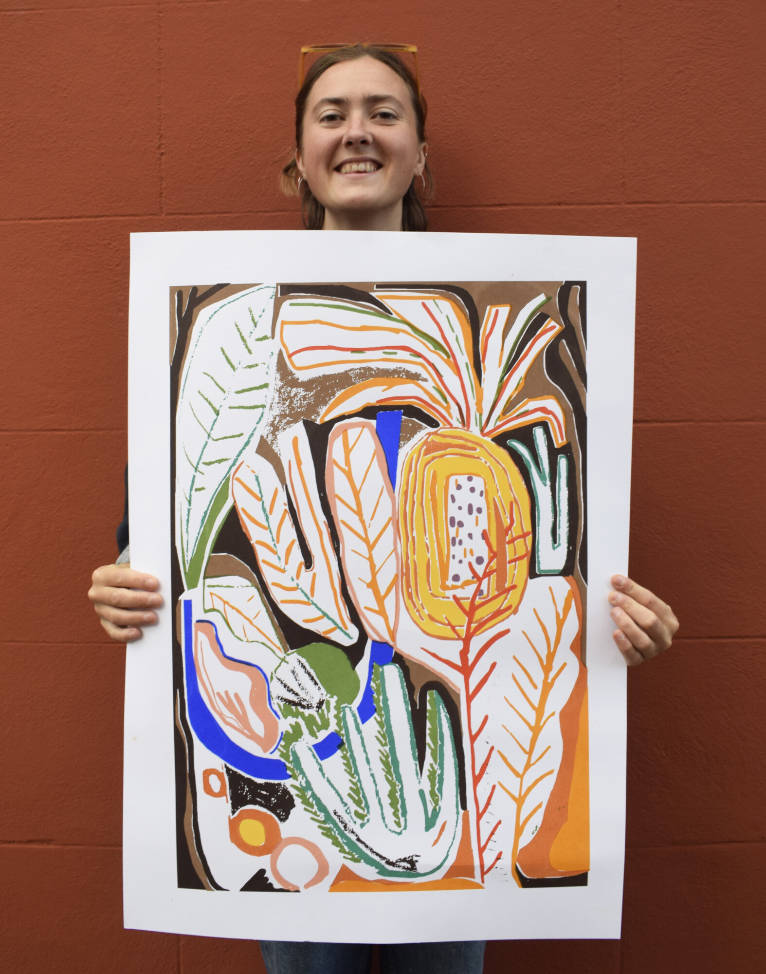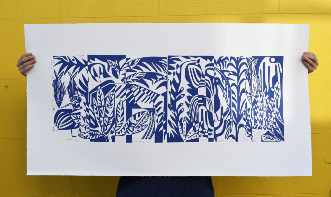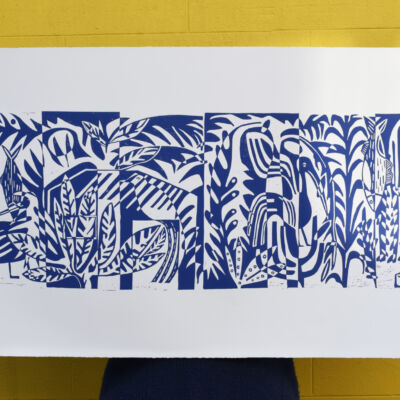 Since graduating, Flora has concentrated on developing her studio practice, creating limited-edition screen prints and lino prints on paper. Her work draws inspiration from the natural world — its curves, shapes and organic patterns — which she carefully arranges to interlock like pieces of a puzzle. She particularly enjoys experimenting with collage to generate new marks and forms, before separating colours and translating ideas into print.